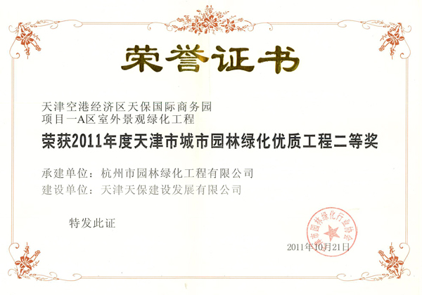 公司一工程榮獲“2011年度天津市城市園林綠化優(yōu)質(zhì)工程二等獎”
