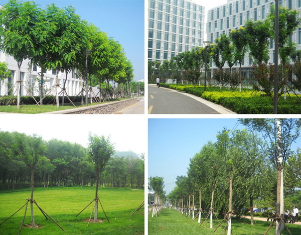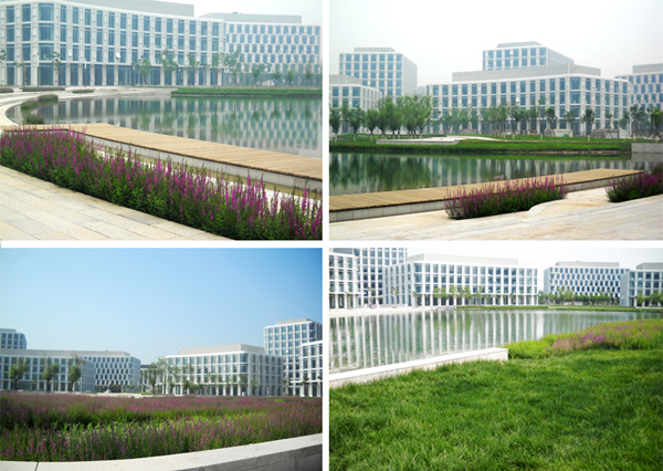 本工程是大型商務(wù)園配套景觀綠化工程,整個項目以人工湖為中心將建筑呈環(huán)形布置,分為內(nèi)環(huán)、中環(huán)、外環(huán)。綠化圍繞建筑均勻有層次的分布,環(huán)路兩側(cè)栽植國槐;辦公樓之間則種植日本晚櫻、碧桃、海棠等觀花、觀葉類喬木,以及黃楊、女貞等灌木和綠籬;中心湖區(qū)域兩側(cè)的能源半島和濕地半島上被喜水性植物覆蓋,起到凈化湖水的作用,岸邊種植垂柳,開辟休閑區(qū)域;園路鋪裝材料選用水洗石、花崗巖,石汀、鋪裝與綠地自然銜接;再加上花壇和景觀小品,各種觀賞性植物互相襯托,喬木與灌木合理搭配,使得景觀與建筑、環(huán)境完美結(jié)合。