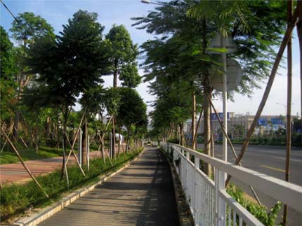 眼前的這條道路開闊大氣、綠色生態(tài),而當(dāng)初施工時(shí),卻面臨著很多難題。該項(xiàng)目定位較高,工期短,交叉施工嚴(yán)重,更經(jīng)歷了濱海的臺(tái)風(fēng)季節(jié)天氣,所以施工中對(duì)施工工序組織、材料組織及機(jī)械勞動(dòng)力的組織顯得尤為重要;由于施工范圍處于交通繁忙的205國(guó)道深圳段,對(duì)施工現(xiàn)場(chǎng)車輛的疏導(dǎo)及路邊作業(yè)的圍護(hù)等的要求都需嚴(yán)格把控;為了保證景觀效果,對(duì)苗木的要求比較高,很多假植的苗木需要用保鮮的方法長(zhǎng)途運(yùn)載到施工現(xiàn)場(chǎng)進(jìn)行種植。“施工中面臨的各種不利因素不但增加了工程成本,更加大了施工難度,但在項(xiàng)目部全體人員工的共同努力下,最終克服種種困難,圓滿完成了任務(wù),展現(xiàn)了杭州市園林綠化工程有限公司優(yōu)質(zhì)高效、創(chuàng)新進(jìn)取的企業(yè)形象,受到各方的一致好評(píng)?!毙煜蛎鞯囊环?jiǎn)短話語(yǔ),卻讓我們感受到了施工期間的諸多辛苦。