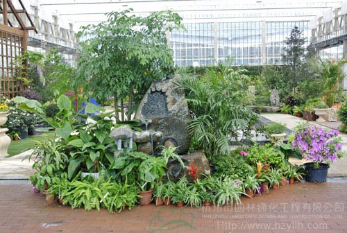 走進(jìn)玻璃溫室的大門,一處小巧別致的水景,掩映在一片綠色中,古樸而有趣的石頭,細(xì)細(xì)的流水,勾勒出一幅恬靜的畫面。兩邊是花園中心的英文縮寫GARDEN CENTER,每一個(gè)英文字母都是一個(gè)小噴泉,流水不斷,與怒放的杜鵑花一起,奏響春天的歡快旋律,拉開(kāi)青山湖?花園中心中庭景觀的序幕。