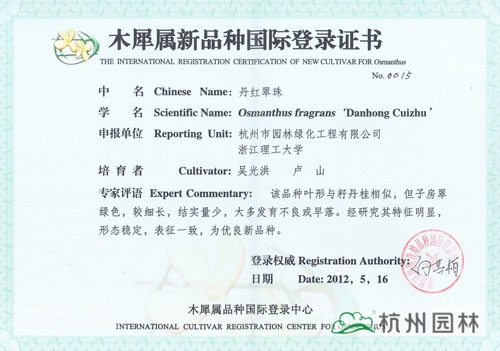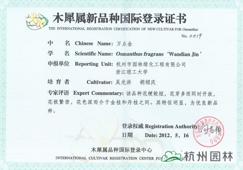 近日,由杭州市園林綠化工程有限公司與浙江理工大學(xué)聯(lián)合研發(fā)的“丹紅翠珠”、“杭州丹桂”、“杭州黃”、“菊瓣”、“萬點(diǎn)金”5個(gè)桂花新品種獲得木犀屬新品種國際登錄證書。截止目前,杭州園林已經(jīng)有12個(gè)桂花品種獲得此項(xiàng)國際登錄權(quán),充分展示了企業(yè)在桂花研究方面的突出成績(jī)。
