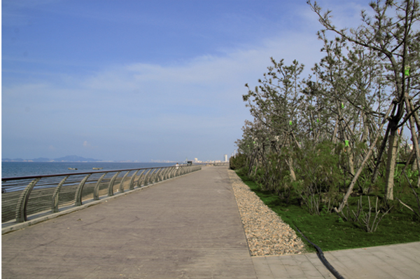 煙臺(tái)屬暖溫帶季風(fēng)氣候,但是瀕海地又受到海洋性氣候的影響,經(jīng)常受海潮海風(fēng)侵襲和土壤鹽漬化、干旱化威脅,導(dǎo)致適宜生存的植物種類(lèi)少、綠化難度大。該項(xiàng)目緊臨海邊,因此,如何正確選擇植物品種,在提高植物成活率的同時(shí)又保證景觀效果的豐富,是其面臨的一大難題。