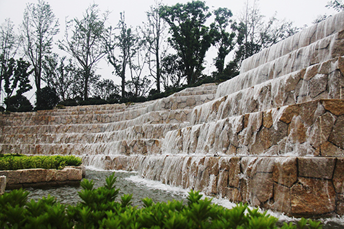 入口水景開闊大氣,行道樹陣整齊劃一。一場歌劇的序曲,不管是澎湃激昂,還是歡快活躍,抑或是柔情舒緩,都將對整個局情起著舉足輕重的作用。入口景觀的作用同樣如此,它是整個園林工程留給人們的第一印象。走進項目主入口,寬40米、高10米的寬闊水景,高達7級的層階落差,水流層層跌落間,水聲轟鳴,仿佛一道瀑布橫掛眼前。3000平方米的地面鋪裝,全部采用50毫米厚的深灰色和芝麻白花崗巖,走在上面,平坦、踏實。兩側(cè)的花壇,邊緣鋪設手法也呈臺階狀,蘑菇石貼面,花崗巖壓邊,與水景遙相呼應?;▔械闹参铮蠈舆x用香樟、銀杏、櫸樹,中層用櫻花、紅葉李,下層用麥冬、水蠟、花石榴及草花,再加上造型樹的點綴,營造出群島效果,使得整個入口景觀莊重典雅,大氣天成。