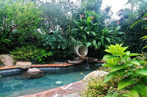 露天泳池熱帶風情,溫泉泡池仿若天成。露天泳池區(qū)景觀獨具特色,選用華棕、棕櫚、布迪椰子、加拿利海棗等熱帶植物作為主景,營造出簡約大方、層次分明的濃郁熱帶園林風情。為了提高這些熱帶植物的成活率,降低后期的養(yǎng)護成本,這批植物都經(jīng)過馴化,較能適應吳江的氣候條件。該區(qū)面積較大,從酒店的觀景平臺上往下看,泳池中間的小島就像彎彎的小船,仿佛要順流而下;水質(zhì)清澈見底,水底大面積的藍色和黃色玻璃馬賽克,營造出波光鱗鱗的效果,流動的線條瞬間充滿了生機和活力,整個泳池仿佛都動了起來。