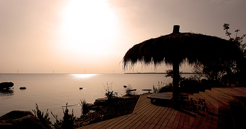 觀景平臺視野開闊,濱湖風光水天一色。臨湖的觀景平臺,原色的木質(zhì)鋪裝,素樸的茅草亭,寬大的躺椅,營造出一個自在的小天地。這處觀景平臺,背后是珍珠泉泡池,泡完溫泉,可以直接來到觀景平臺,遠眺太湖的煙波浩渺,水天一色。