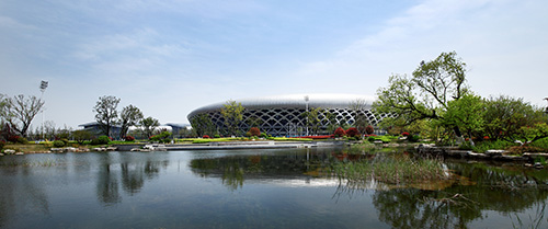 據(jù)夏修智介紹,奧體公園是工程的主要景觀節(jié)點(diǎn),位于奧體中心西北側(cè),面積約5萬平方米,是一座集娛樂、運(yùn)動(dòng)為一體的特色濱水運(yùn)動(dòng)公園,也是整個(gè)奧體中心的“綠肺”。一條蜿蜒的河流將公園劃分為東部運(yùn)動(dòng)區(qū)和西部休閑公園區(qū)。運(yùn)動(dòng)區(qū)緊挨訓(xùn)練中心,東側(cè)便是足球場、籃球場和排球場,運(yùn)動(dòng)后就能感受到融入大自然的清新;休閑公園區(qū)包括入口廣場、樹陣廣場、以及河水匯聚而成的小人工湖,湖邊蘆葦迎風(fēng)擺動(dòng),湖水清澈見底,鵝卵石鋪就的湖底清晰可見。整個(gè)奧體公園以中國古典園林為主、回歸自然的組團(tuán)式造景手法,強(qiáng)調(diào)休閑、幽靜、生態(tài)自然。從西入口廣場的草坡,逐漸過渡到觀賞性強(qiáng)的觀花、觀葉園林樹種,配合灌木、草木、地被形成人為景觀,從西到東植物次第減少,層次不斷變化,形成了從自然生態(tài)狀綠化到人工幾何狀綠化的逐漸過渡,讓自然的活力與體育精神融為一體。
