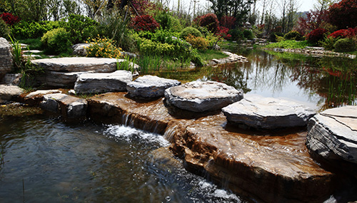 其中,人工湖面積7000平方米,小而精致,可謂是整個(gè)公園的“點(diǎn)睛之筆”。由親水平臺區(qū),源頭區(qū),中心湖面區(qū),鄰水生態(tài)區(qū),橋梁區(qū)構(gòu)成。湖面區(qū)域貫穿整個(gè)工程,沒有自然條件的襯托,完全由人工園林造景手法完成,在鄰水景觀帶種植睡蓮、荷花、再力花、千屈菜、鳶尾、蘆葦?shù)人参铮瑺I造生態(tài)岸線,同時(shí)選擇其他親水植物,如美人蕉、碧桃、楊柳、水杉作為過渡和背景,虛實(shí)結(jié)合,營造出多方位的景觀效果。湖面雖小,但結(jié)構(gòu)完整,假山疊水,拱橋,原石臨水橋,湖邊卵石生態(tài)群落一應(yīng)俱全。其中,景石主要使用了安徽的靈璧景石,約7000噸,堆疊出水源、暗橋、親水沿岸等景觀。