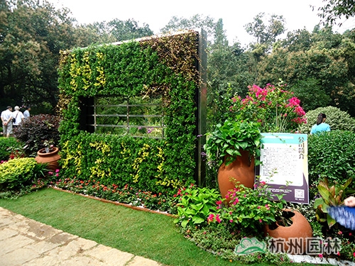 走進(jìn)畫境園,只見主入口左側(cè)種植著兩株一高一矮的厚皮香樹,郭昌如笑著說,“這兩棵厚皮香寓意的是兩個(gè)萬分自豪的森林衛(wèi)士——熊大和熊二,你看,熊二還滿臉熱情地向游人不停地招手示意呢?!敝魅肟谟覀?cè)是一面立體綠植墻,所用的植物主要為黃金絡(luò)石、金寶石冬青、小葉梔子花、金邊黃楊等?!傲Ⅲw綠植墻是立體綠化的主要形式,畫境?青山湖花園中心推出的這款立體綠植墻產(chǎn)品,可以根據(jù)客戶需要,結(jié)合氣候、溫度、濕度、色彩等綜合條件,選配四季長綠或色彩豐富的植物,隨時(shí)在人們想要的地方構(gòu)建出一個(gè)貼近自然又超脫自然的生活環(huán)境,可謂是簡單又方便?!惫缃榻B道。立體綠墻的兩側(cè),隨意地散落著一些紅陶罐,與金寶石冬青、龜甲冬青等精品球形植物,三角梅、月季、常春花、雞冠花等花卉,紫葉狼尾草、晨光芒、矮蒲葦?shù)扔^賞草混搭,營造出一種溫暖、和煦的庭院景觀?!叭绻丫G植墻看成是城市的建筑,此景則喻意美麗杭城的繁華一角?!惫缪a(bǔ)充說。綠植墻的中間還別出心裁地設(shè)置了一扇窗戶,透過它,園內(nèi)的美景已隱約可見。