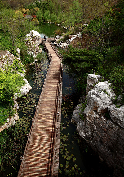 四大靜園位于北坡,分別名為彩徑觀花園、石林聽濤園、秀谷韻樂園和唱竹攬翠園,四個園子主題明確,景深豐富,個性分明,匠心獨具,一草一木別有風(fēng)韻。其中,石林聽濤園位于公園西南側(cè),是一座秀美的古典園林,具有濃郁的江南水鄉(xiāng)特色,由紅梅、南天竹、臘梅等植物組成的漂亮花境,給人帶來賞心悅目之感;蜿蜒曲折的木棧道則連接起了園內(nèi)的汀步和園路,帶領(lǐng)游人去欣賞園內(nèi)的每一處美景。唱竹攬翠園位于公園中部,全園格局顯得緊湊自然,豐富的植物應(yīng)用,使得園內(nèi)一年四季景色各異,特別是剛竹、紫竹、鳳尾竹、湘妃竹、慈孝竹等竹子的應(yīng)用,更是呼應(yīng)園名,行走在園內(nèi),伴隨著陣陣清風(fēng)徐來,讓人仿佛置身于“竹海聽濤”的悠閑意境中。