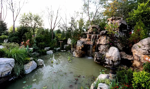 海綿城市是指城市能夠像海綿一樣,在適應(yīng)環(huán)境變化和應(yīng)對(duì)自然災(zāi)害等方面具有良好的“彈性”,下雨時(shí)吸水、蓄水、滲水、凈水,需要時(shí)將蓄存的水釋放并加以利用。展園內(nèi)采用碎石鋪就的“茶馬古道”,既能有限地補(bǔ)充地下水,又有一定的地表徑流削減作用。另外,園內(nèi)水池邊設(shè)置植被緩沖帶,通過植物攔截及土壤下滲作用有效減緩地表徑流流速,并去除徑流中的部分污染物,體現(xiàn)了海綿城市理念的截污凈化功能。