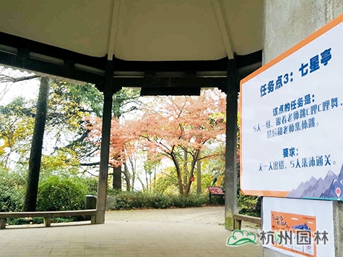 本次活動的終點為玉皇山頂?shù)摹敖挥[閣”。玉皇山是杭州絕佳的觀秋景高地,站在山頂,可俯瞰杭州全城,八卦田的神秘、西湖的絢麗等盡收眼底;山上則是古樹參天,紅葉似火,黃葉賽金,彩林岑巒疊峰,如入畫里。大家從玉皇山北門上山,途經林海亭、老玉皇宮、櫻花地、紫來洞天、七星亭,最后到達山頂?shù)摹敖挥[閣”。此次登山途中設立了3個任務點,參加活動人員需要完成相應任務,才能蓋章通關。