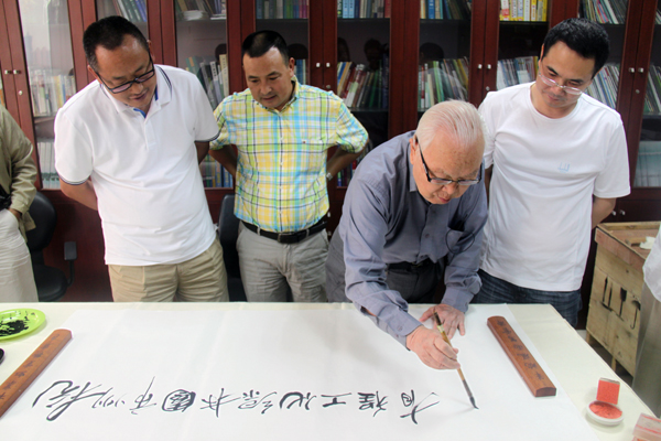 孫老不僅是一位園林規(guī)劃設(shè)計(jì)專家,同時(shí)也是一位書畫名家,他曾師從徐悲鴻、孫多慈教授學(xué)畫,具有很高的藝術(shù)修養(yǎng)。在我們的邀請(qǐng)下,孫老欣然提筆,寫下了“杭州市園林綠化工程有限公司”、“易大景觀”等公司名稱,以及“天然圖畫”、“造化為師”等題詞,以精準(zhǔn)的語言凝煉了他對(duì)園林行業(yè)的看法,寥寥數(shù)語中,讓我們深受啟發(fā)。行云流水的筆法、流暢飽滿的線條,每一幅題字都一氣呵成,每一幅題字都是一幅藝術(shù)畫。每幅題字寫完,大家都會(huì)報(bào)以熱烈的掌聲,孫老對(duì)園林的深刻見解及深厚的書法功底令我們深深折服。