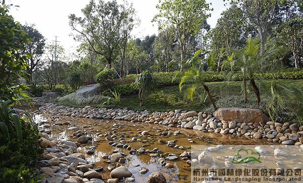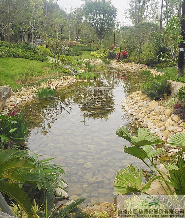 下雨時蓄水,用于植物的日常澆灌;干旱時,鋪滿鵝卵石的水底又可與周邊豐富的植物營造出另一種園林意境