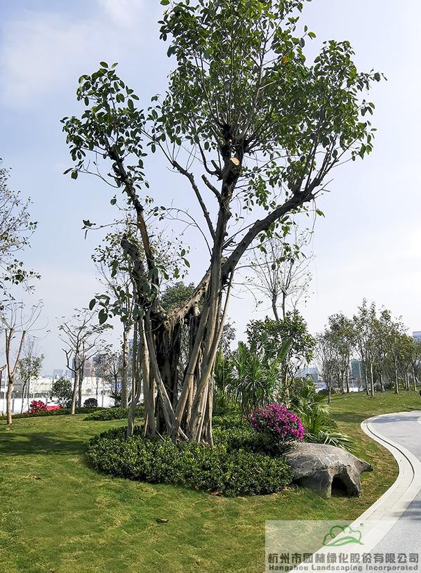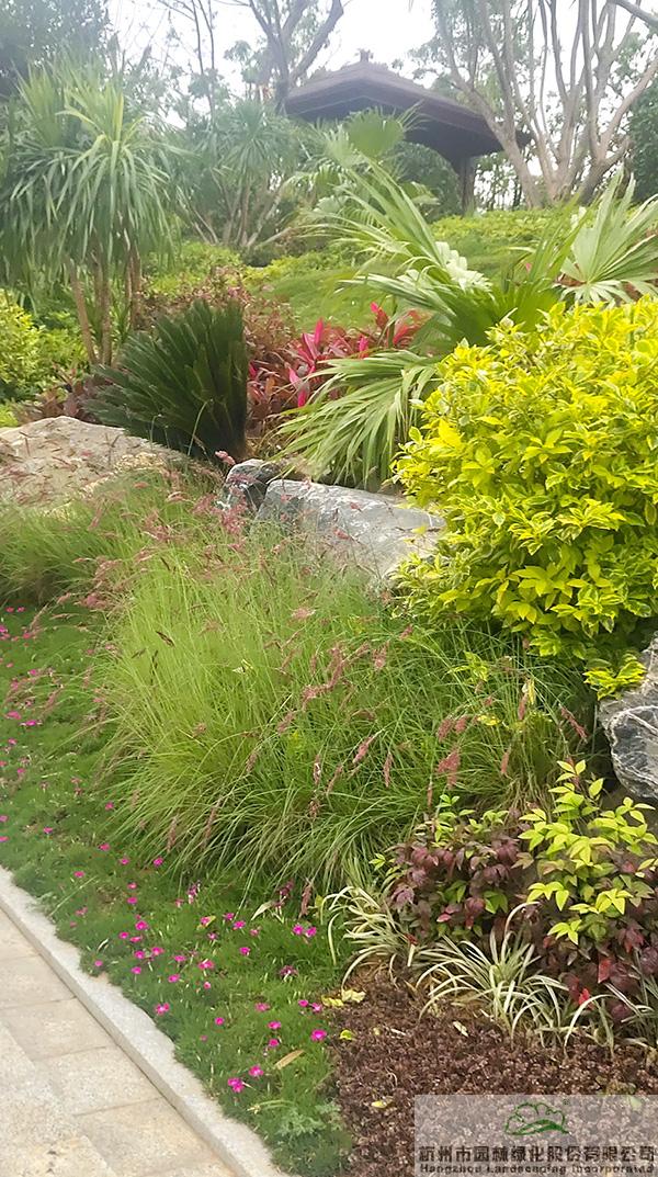 地被植物和小灌木充實園林的下層空間,往往起到“鑲邊”的效果,如果種植不好,很容易使底部出現(xiàn)裸露的土壤,景觀效果大打折扣。而該項目在現(xiàn)場放樣之后,先對地形進行處理,形成一定的坡度,然后在地被植物或小灌木種植時,上面坡度高的地方平種,隨著逐漸向下方邊緣靠近,植物種植向下方傾斜,逐步過渡,從上到下形成弧線,將土壤遮蓋?!斑@種處理手法,不但使下層空間看著自然美觀,而且避免了地面出現(xiàn)裸露情況。”葉偉華的言語中,不經(jīng)意間流露的,是杭園人對細節(jié)的極致追求。