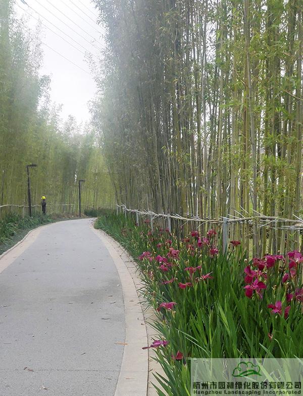 春天,鳶尾花開,為這條幽靜的竹林小道增添了無限生機