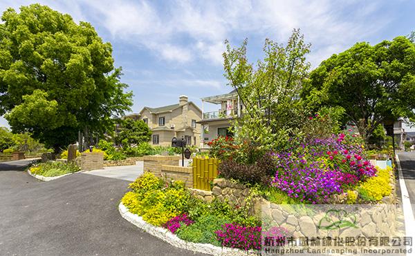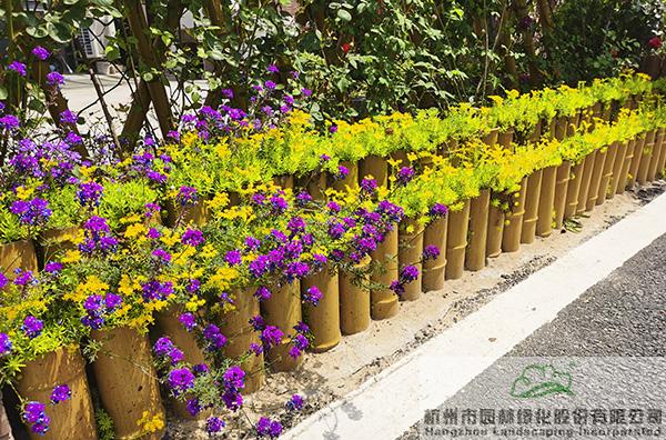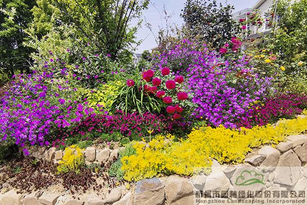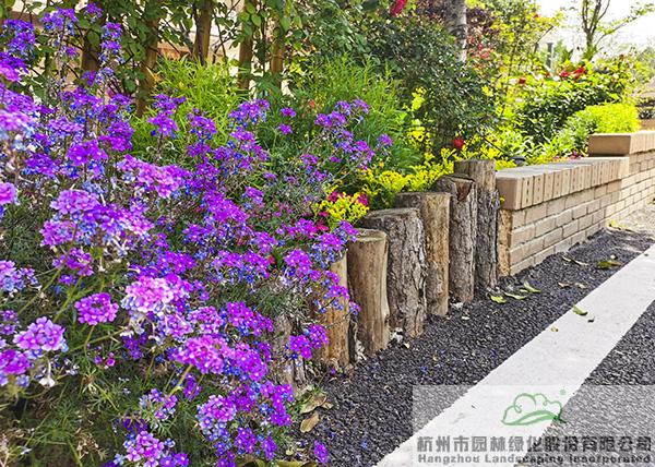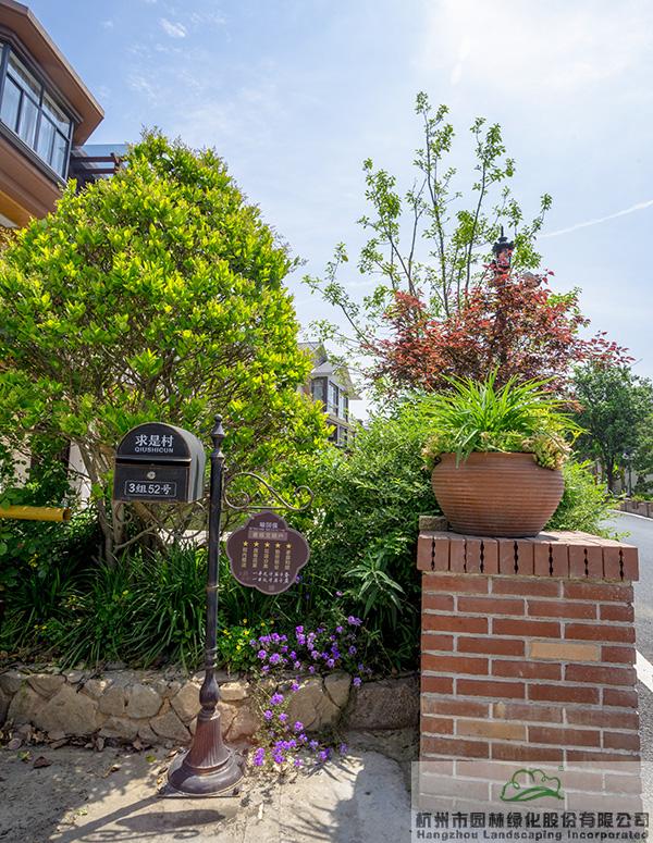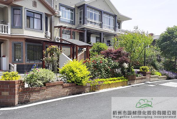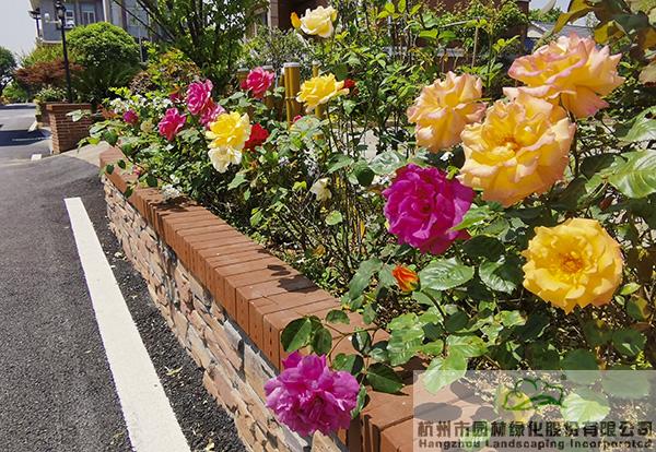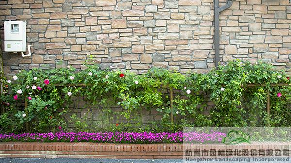 景墻邊的植物配置同樣有講究。利用銀杏、桂花、梅花、紅楓等植物營(yíng)造上層空間,這些植物具有遮擋作用,能夠?yàn)橥ピ籂I(yíng)造一定的私密空間。通過(guò)樹(shù)狀、球狀、攀援、傘狀、字母等各種形態(tài)的月季,金冠女貞球、龜甲冬青球、銀姬小蠟球、藍(lán)莓、八仙花、小葉梔子、翠蘆莉、花葉千鳥(niǎo)花、藍(lán)山鼠尾草、紫葉狼尾草等小喬灌木,在打造中層空間的同時(shí),和美女櫻、金娃娃萱草、花葉玉蟬花、花葉香桃木、紫菀、澤蘭、礬根、五彩絡(luò)石、石竹等下層空間植物一起,裝飾和襯托景墻,使家家戶戶的景觀更加豐富多變。