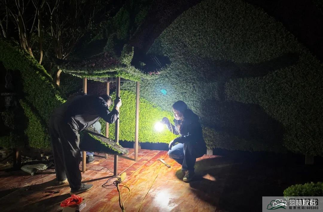 受交通管制等的影響,很多材料只能晚上9:00以后才能進(jìn)場(chǎng)。作為現(xiàn)場(chǎng)負(fù)責(zé)人,江曉鈺提前與植物園管理人員溝通備案,確保運(yùn)輸車輛暢通無(wú)阻;安排人員及時(shí)進(jìn)行場(chǎng)地清理,規(guī)劃物料區(qū)、施工作業(yè)區(qū)、車輛暫停區(qū)等,盡快完成卸貨、擺放;對(duì)于需吊裝的部分,精準(zhǔn)安排吊運(yùn)點(diǎn),避免二次搬運(yùn)。根據(jù)菊花展主辦方要求,綠雕整體后移80cm。