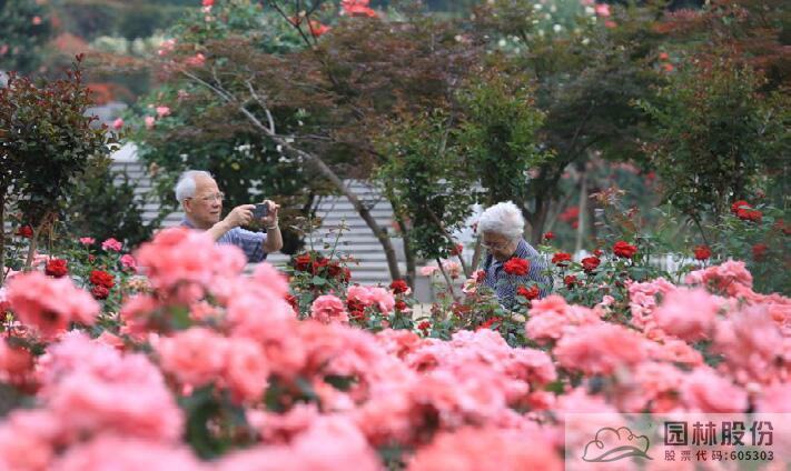 以月季為主題植物,在公園主要出入口、花壇及草坪區(qū)域配植多種月季園藝品種,形成主題花園,開(kāi)啟多彩四季。