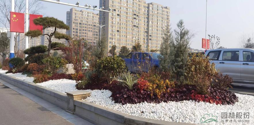 在江山大道與黃山路、黃浦江路與項(xiàng)王路路口在植物配置上,采用群落結(jié)構(gòu)、組團(tuán)配置和盆景化的自然式造園手法,在空間、色彩、節(jié)奏方面獨(dú)具匠心,打造了高低錯落、疏密有致的和諧景觀??紤]到行車安全性與視線誘導(dǎo)因素??紤]到行車安全性與視線誘導(dǎo)因素,中央綠化隔離帶以黑松樁的種植片段和花鏡+球類的自然群落片段進(jìn)行循環(huán),打造規(guī)則中有自然的效果。機(jī)非綠化隔離帶以黑松樁+花鏡種植,打造艷麗的春景效果。