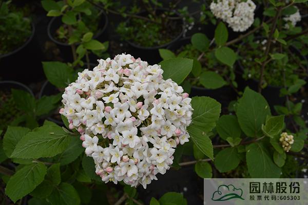 忍冬科莢蒾屬,落葉灌木,株高3-4.5 m,為瓊花和紅蕾莢蒾的雜交種。葉片較厚,較大,到秋季變成酒紅、橙紅或紫色色調(diào)。聚傘花序花蕾粉紅色,開放后白色,聚集似小雪球,具芳香,花徑8-14cm,花期3-4月。喜光,半陰環(huán)境也生長良好,生長速度中等;擇土不嚴,微酸性、中性至微堿性土壤均可生長,尤喜濕潤、排水良好的富含有機質(zhì)土壤;抗寒性強;耐修剪,適合自然風格的工程應用或庭院觀賞。