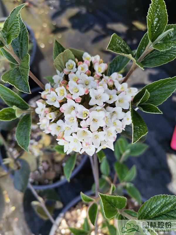 忍冬科莢蒾屬,半常綠或常綠灌木,株高2-3 m,為紅蕾莢蒾和煙管莢蒾的雜交種。葉色深綠,秋季轉(zhuǎn)紅,顏色程度因所處地區(qū)而異。該種繼承了紅蕾莢蒾粉花的優(yōu)良基因,花序未開放時呈現(xiàn)靚麗的粉色,開放后白色,且具有較濃郁的花香?;◤揭话?.5-10 cm,花期3-4月。植株具有良好的頂端優(yōu)勢,枝條年生長量大,但分枝能力稍弱。幾乎無病蟲害。適應性強,生長速度快,耐干旱且耐寒,適合自然風格的工程應用或庭院觀賞。