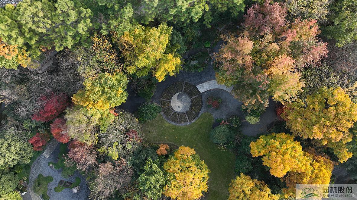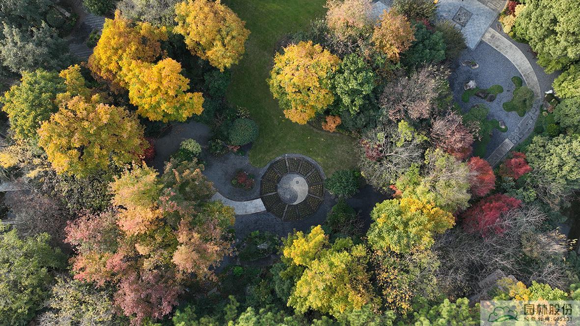 俯視畫境園南園,楓香林在陽(yáng)光中的色彩愈加斑駁,無患子綠色尚未全部褪去,金黃色樹冠愈加油亮,盡顯英式風(fēng)景林的自然、灑脫。