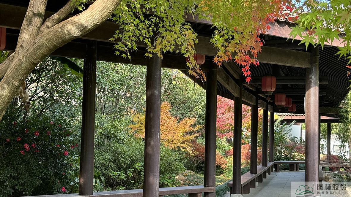 中式庭院中,紅楓將古色古香的木結(jié)構(gòu)長(zhǎng)廊襯托的更具江南古典園林氣息