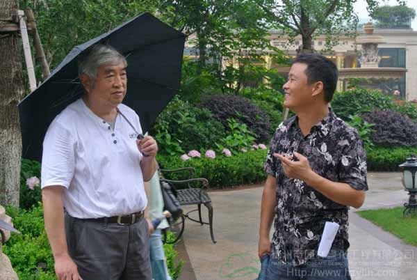 中國(guó)風(fēng)景園林學(xué)會(huì)園林工程分會(huì)秘書長(zhǎng)商自福(左)在現(xiàn)場(chǎng)進(jìn)行考察